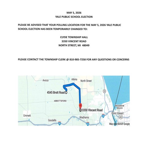 The temporary precinct location for the May 5, 2026 Election will be held at the Clyde Township Hall, 3350 Vincent Road, North Street, MI 48049.